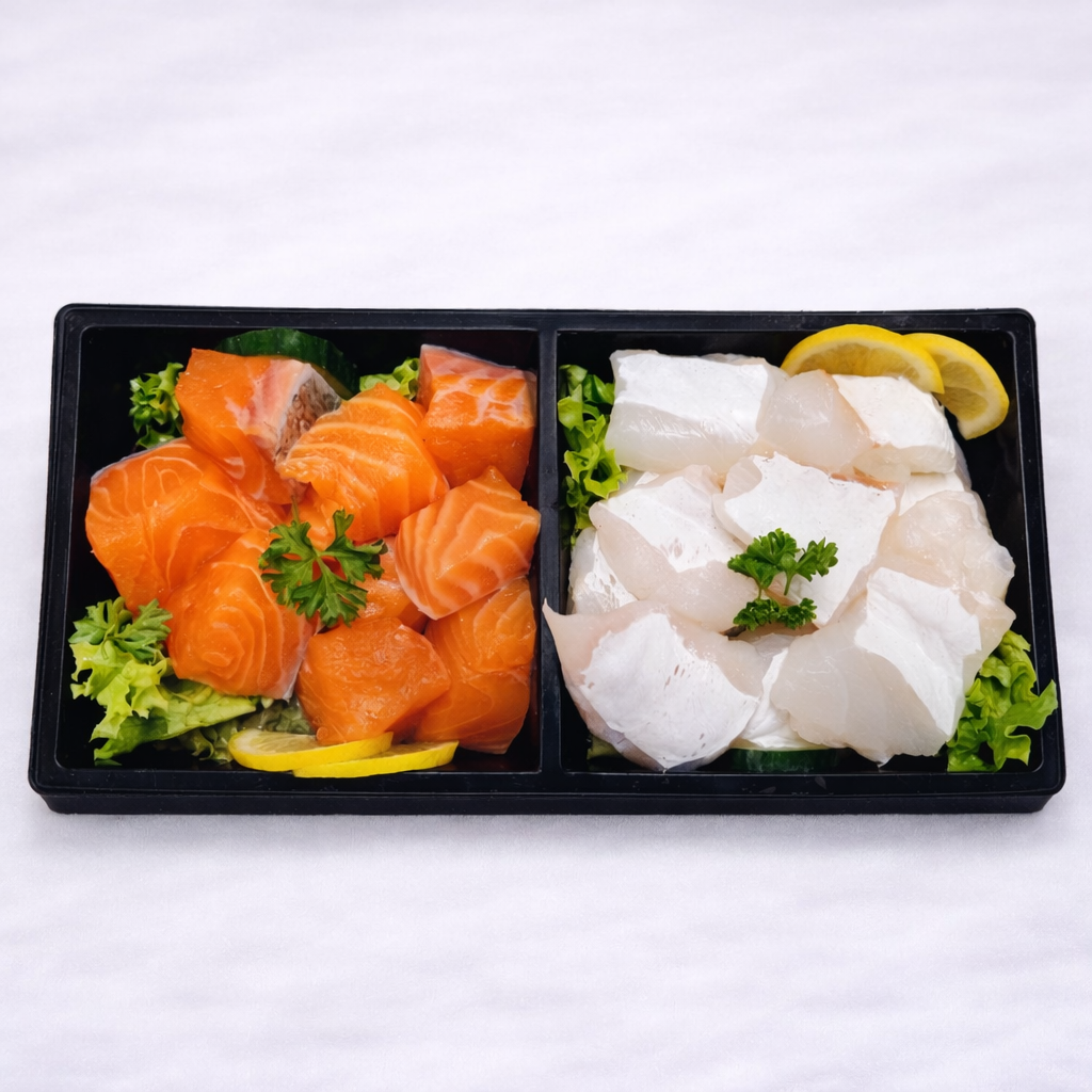 Bevat een combinatie van zalm en kabeljauw, gesneden in blokjes – een heerlijke mix van twee populaire vissoorten.