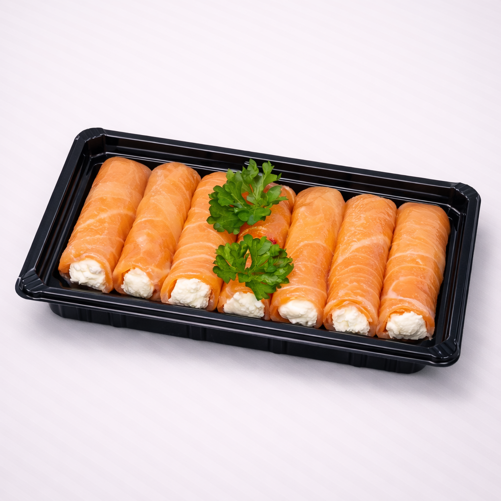 Gerookte zalmrolletjes met roomkaas De combinatie van de milde rooksmaak van de zalm en de frisse, zachte roomkaas zorgt voor een verfijnde en evenwichtige smaak.